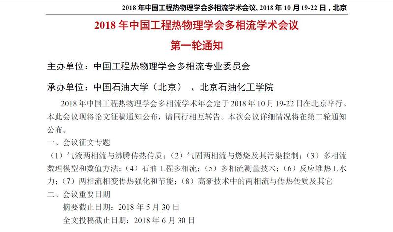 2018 年中国工程热物理学会多相流学术会议, 2018 年10 月19-22 日,北京