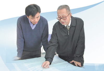 秦裕琨(右)在和同事研究图纸 (冯健 摄)