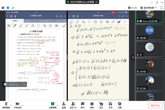 为深入开展主题教育与贯彻落实党的二十大精神,引导党员师生把主题教育点燃的热情转化为服务师生的强大动力。2023年6月2日,能源学院先进动力所博士生第一党支部与基础学部智能装备2202701团支部进行了2023年春季第一次党团支部对接活动。因为近期团支部同学面临微积分期末考试,学习压力大,党支部应团支部同学邀请,开展了线上答疑活动。本次活动由先进动力博士生第一党支部彭泽众同志为团支部同学们进行了线上答疑活动。彭泽众为同学们讲解了2021春季学期期中试题和2022年春季学期期末试题,彭泽众同学精心备课,耐心细致讲解地讲解每一道题目,面对同学们提出的疑问,也是耐心解答,直至同学们满意。最后,彭泽众还向各位同学介绍了自己在求学期间的学习心得,他建议同学们要灵活运用所学的知识,争取取得好成绩。