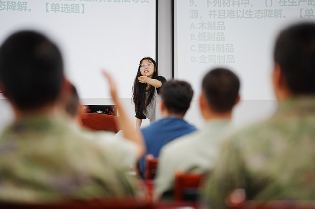 8月25日,第二步“走出去”:团队前往部队营区开展实地见学活动,深入感受新时代军人风采,通过采访了解官兵日常生活以及部队训练情况,观摩连队内务建设,并由团队负责人王雨柔结合学院专业特色开展“双碳”知识理论宣讲和知识竞赛活动。