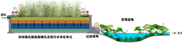 湿地植物优选和复配,形成根际菌群互营,高效分解有机物,促进氮磷吸收,促进植物生长,实现污染物资源化,污水回用作为景观用水。温室大棚保证冬季条件下稳定运行。